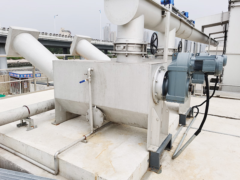 由前道的固液分离机械滤渣经料斗直接扔入本设备进料口。在此该区受到冲洗水针对性地强力冲洗,可将滤渣中溶解物质有效地冲洗出来。冲洗用水用户可以采用来自二沉池的澄清水,或通过潜水泵抽吸栅后水渠内被过滤的污水。冲洗水连同洗下的溶解物质流出栅网,流入污水处理厂的进水渠。冲洗之后的干净滤渣被进一步地传输,压榨脱水,脱水后的渣因含量>45%。