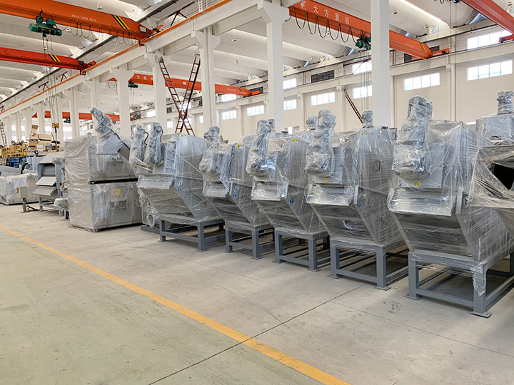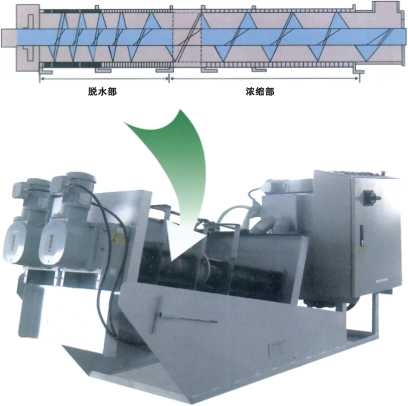 污泥在浓缩部经过重力浓缩后,被输送到脱水部,在前进的过程中随着滤缝及螺距的逐渐变小,以及背压板的阻挡作用下,产生大的内压,容积不断缩小,达到充分脱水的目的。