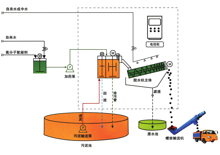 1、通过电控柜,与泡药机、进泥泵、加药泵等进行连动,实现24小时连续无人运行。