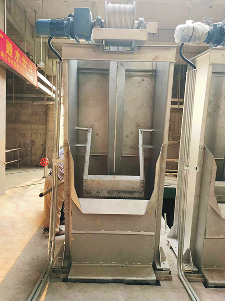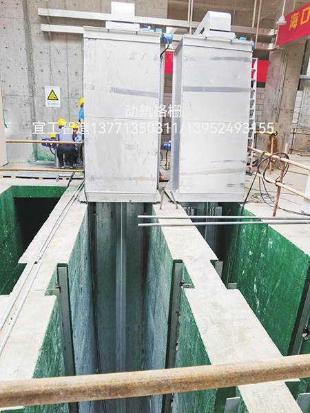 动轨式格栅除污机主要由出渣耙斗、提升装置、卸污装置、导轨、液压推杆、水下栅体、地面支架等部件组成。