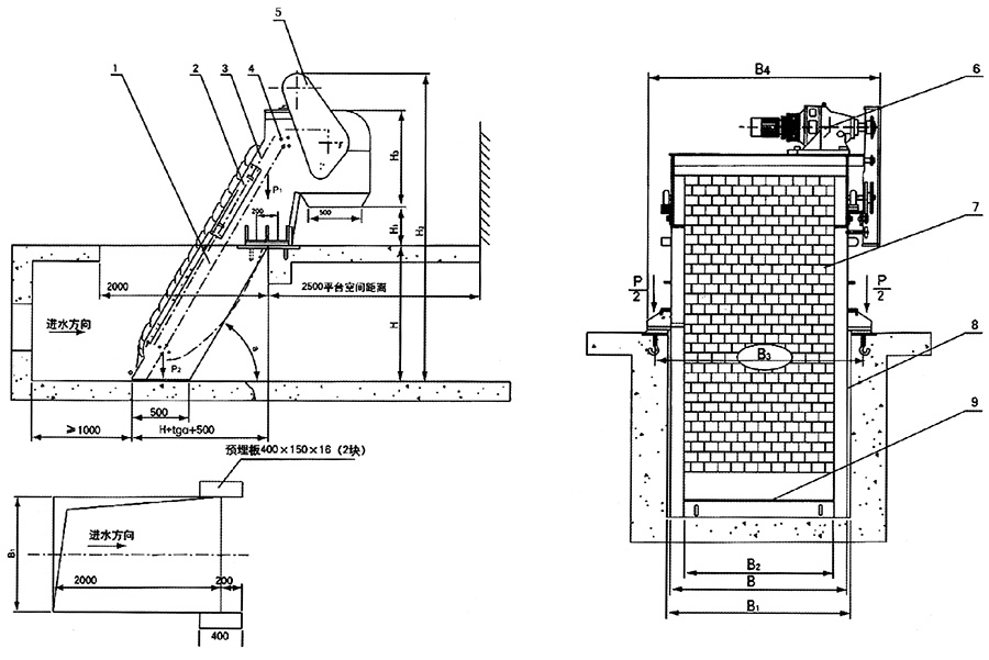 该设备釆用回转式,由一种特殊形状的犁形耙齿按一定的装配顺序的数量排列在横轴上,组成耙齿链,根据过水流量,装配成不同的间隙,安装在泵站或水处理系统的入口处,当驱动装置带动耙齿链自下向上运动时,水中的杂物被耙齿链捞起,液体则在栅隙中流过,设备转动到上部顶点后,耙齿链改变运行方向,由上向下运动,物料依靠自重从耙齿上自行脱落,当耙齿从反面转到底部时,又开始另一循环往复的连续运行,从而不断的从水中清捞杂物,达到固液分离的目的。